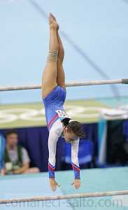 Liudmilla Ezhova bars pak salto release move transition from the high bar to the low bar at the 2004 Athens Summer Olympics.
