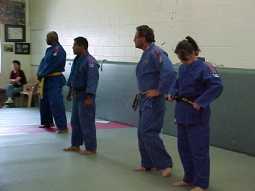 Stanford/U.S. Paralympic team head coach Raul Tamayo and the black belts at the blind judo kids clinic at Cahill's Judo Academy in San Bruno, CA. KRON 4 News Taping in April 2004.